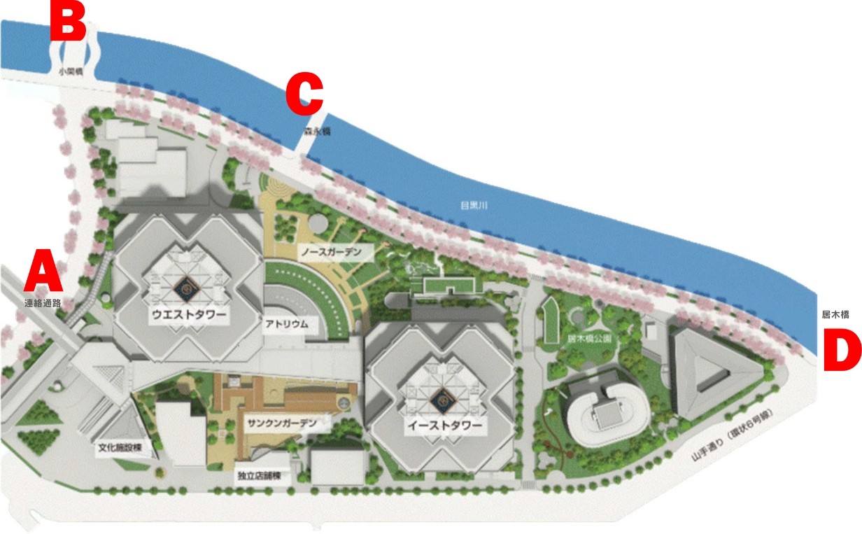 居木橋へはイーストタワーエントランスを出て、目黒川沿い歩道を下流方向へ徒歩2,3分です。