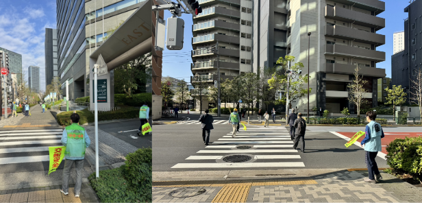 信号のある個所や、ゲートシティ大崎構内の横断歩道などで町会交通部とサポーターズの方々が安全気旗を持って、皆さんの安全な横断を見守ります。