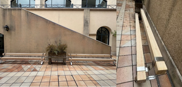 ゲートシティ大崎休憩スペース「ガーデニングデッキ」2 階、3 階外席にシンプルな木製ベンチが 5 台設置されたのをご存じでしょうか?
